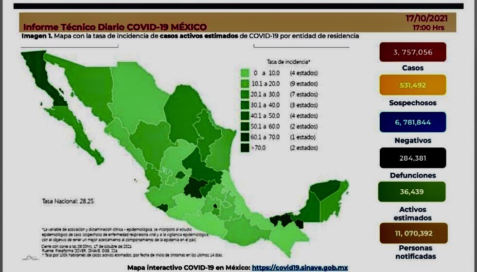 La Secretaría de Salud informó este domingo que México suma 3 millones 757 mil 56 casos y 284 mil 381 muertes por COVID-19.