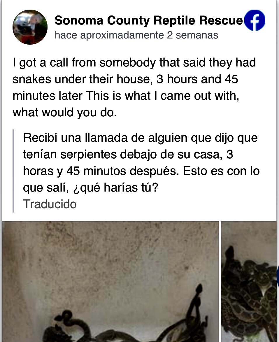 Una mujer, residente del condado de Sonoma, solicitó auxilio tras advertir la presencia de serpientes debajo de su casa.