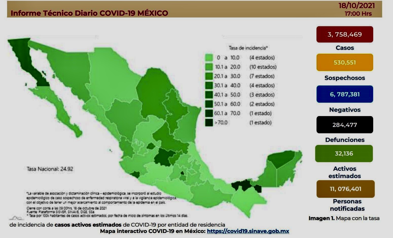 La Secretaría de Salud informó este lunes que México suma 3 millones 758 mil 469 casos y 284 mil 477 muertes por COVID-19.