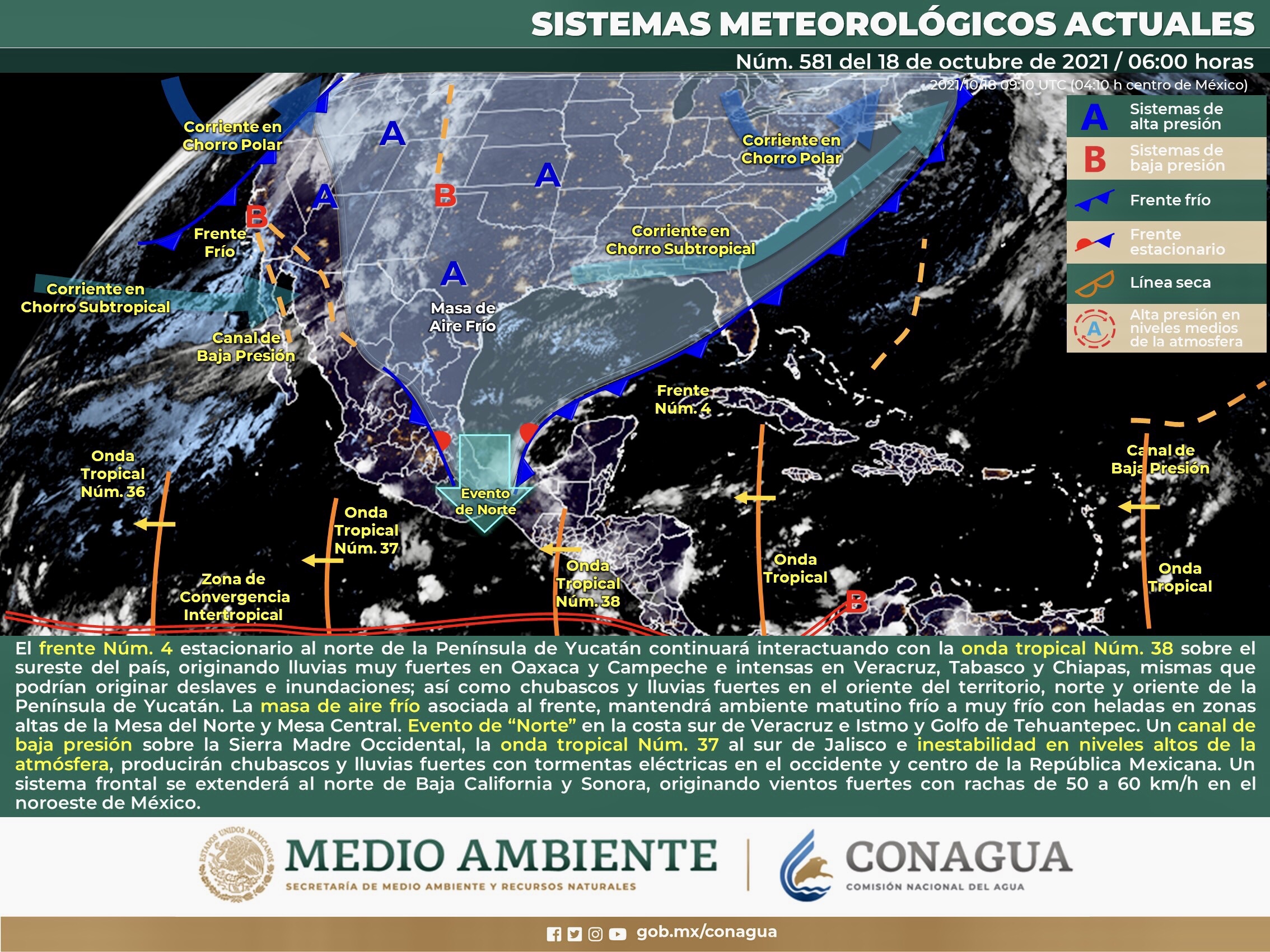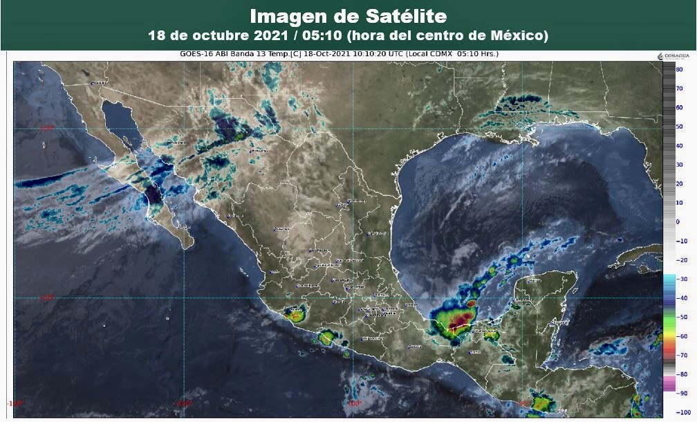 Para hoy, se pronostica que el frente Núm. 4 adquiera características de estacionario al norte de la Península de Yucatán y que continúe interactuando con la onda tropical Núm. 38 que se desplazará sobre el sureste del territorio nacional, produciendo lluvias puntuales muy fuertes en Oaxaca y Campeche e intensas en Veracruz, Tabasco y Chiapas, las cuales podrían originar deslaves e inundaciones, además de generar chubascos y lluvias fuertes en el oriente del territorio, norte y oriente de la Península de Yucatán. La masa de aire frío que se asocia al frente, mantendrá ambiente matutino frío a muy frío con probables heladas en zonas altas de la Mesa del Norte y Mesa Central, además de evento de “Norte” en la costa sur de Veracruz e Istmo y Golfo de Tehuantepec. Por otra parte, un canal de baja presión sobre la Sierra Madre Occidental, el desplazamiento de la onda tropical Núm. 37 al sur de Jalisco e inestabilidad en niveles altos de la atmósfera, producirán chubascos y lluvias fuertes con tormentas eléctricas en el occidente y centro de la República Mexicana. Un sistema frontal se extenderá al norte de Baja California y Sonora, originando vientos fuertes con rachas de 50 a 60 km/h en el noroeste de México.
