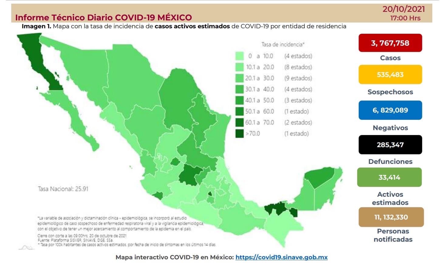 La Secretaría de Salud informó este miércoles que México suma 3 millones 767 mil 758 casos y 285 mil 347 muertes por COVID-19.