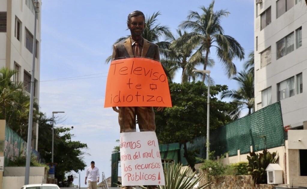 El Colectivo Izquierda Unida de Acapulco protestó frente a la estatua colocada en la zona Dorada del puerto; señalan que la figura costó 300 mil pesos, lo que consideraron un gasto insultante.