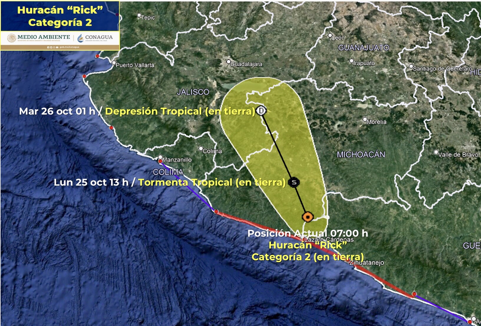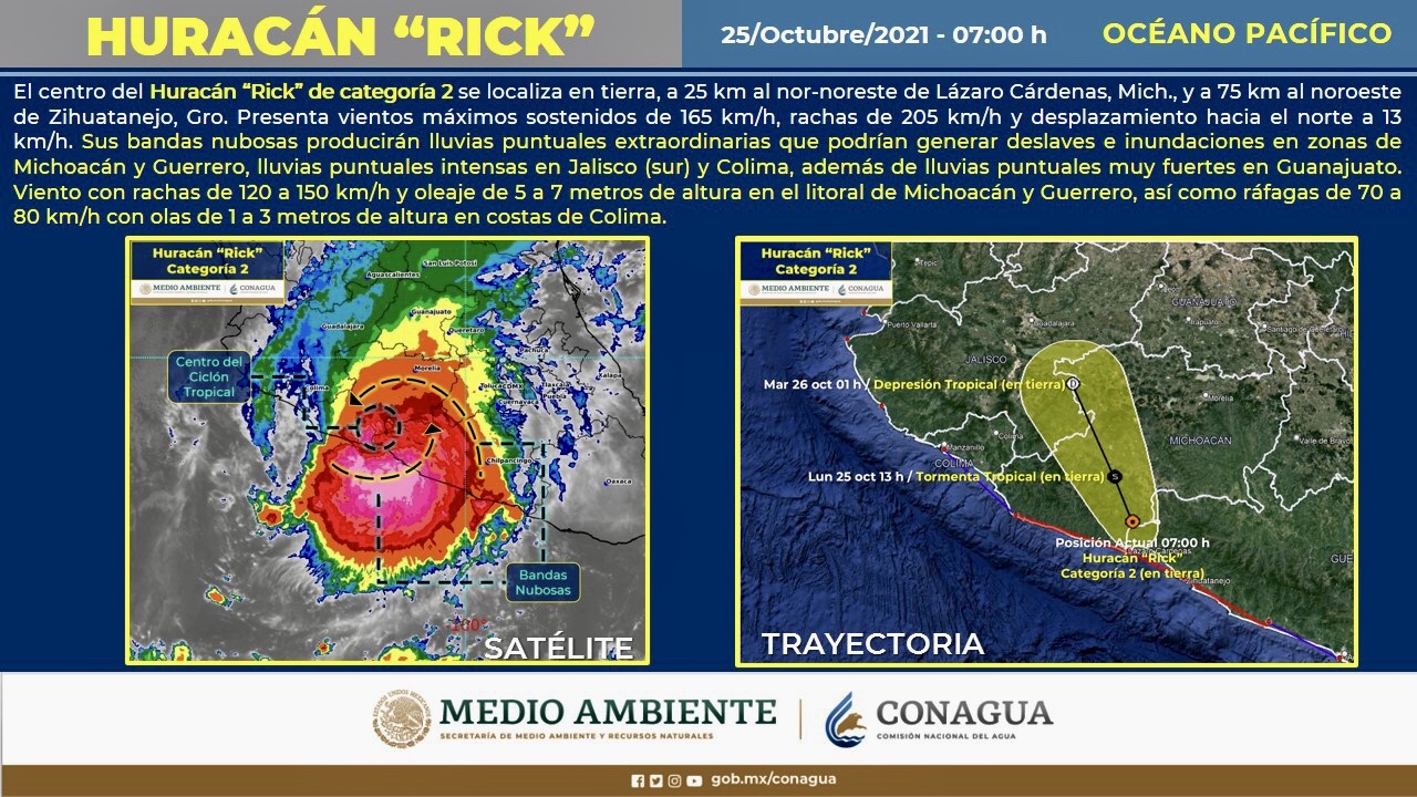El centro del huracán “Rick” de categoría 2 en la escala de Saffir-Simpson, se localiza en tierra en las inmediaciones del municipio de Arteaga, Mich. Sus bandas nubosas ocasionan lluvias muy fuertes a puntuales extraordinarias, vientos fuertes y oleaje elevado en estados del occidente y sur del país.