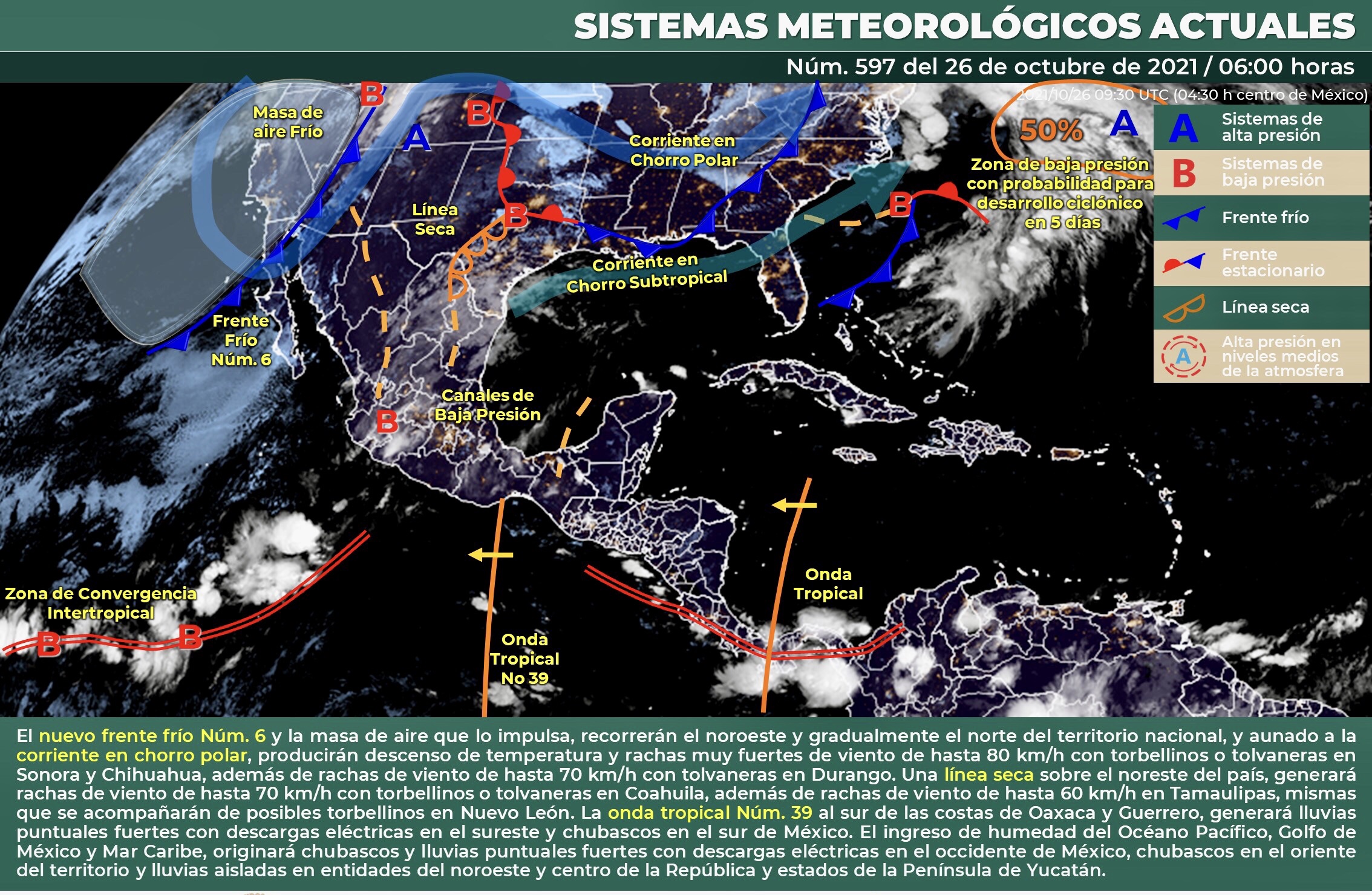 Para hoy, el nuevo frente frío Núm. 6 y la masa de aire que lo impulsa, recorrerán el noroeste y gradualmente el norte del territorio nacional, y aunado a la corriente en chorro polar, producirán descenso de temperatura y rachas muy fuertes de viento de hasta 80 km/h con torbellinos o tolvaneras en Sonora y Chihuahua, además de rachas de viento de hasta 70 km/h con tolvaneras en Durango.