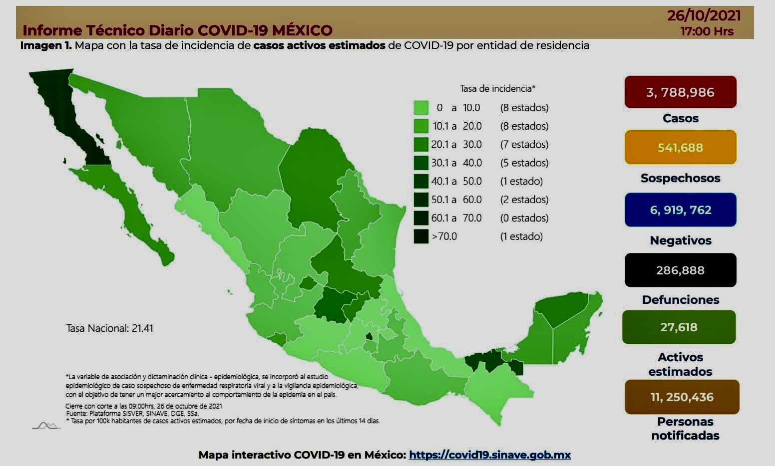 Este martes, México suma 3 millones 788 mil 986 casos y 286 mil 888 muertes por esta causa.