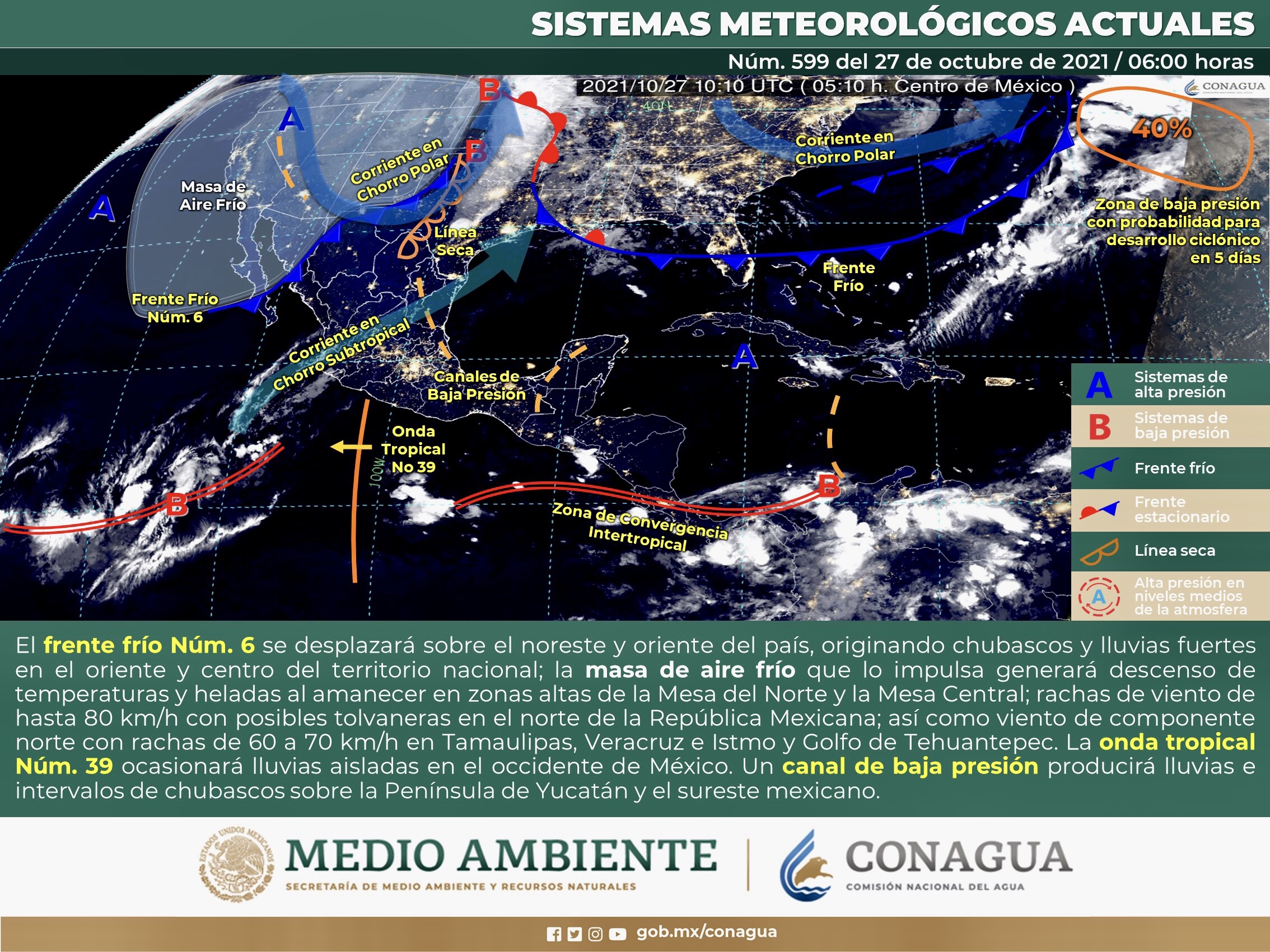 Este día, el frente frío Núm. 6 se desplazará sobre el noreste y oriente del país, originando chubascos y lluvias fuertes en el oriente y centro del territorio nacional; la masa de aire frío que lo impulsa generará descenso de temperaturas y heladas al amanecer en zonas altas de la Mesa del Norte y la Mesa Central; rachas de viento de hasta 80 km/h con posibles tolvaneras en el norte de la República Mexicana; así como viento de componente norte con rachas de 60 a 70 km/h en Tamaulipas, Veracruz e Istmo y Golfo de Tehuantepec. Por otra parte, la onda tropical Núm. 39 se desplazará frente a las costas de Michoacán y Colima, ocasionando lluvias aisladas en el occidente de México. Un canal de baja presión sobre la Península de Yucatán y el sureste mexicano, producirá lluvias e intervalos de chubascos en dichas regiones.