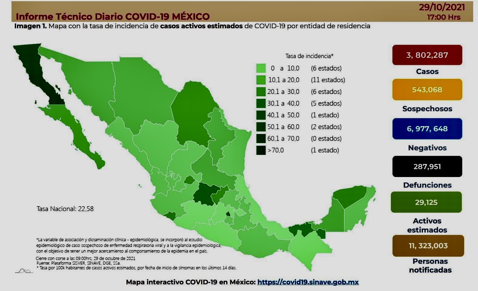 La Secretaría de Salud informó este viernes que México suma 3 millones 802 mil 287 casos y 287 mil 951 muertes por esta causa.