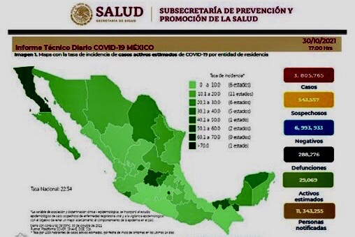 La Secretaría de Salud federal informó que México suma tres millones 805 mil 765 casos y 288 mil 276 muertes por esta causa.