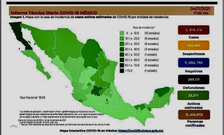 La Secretaría de Salud informó que México suma 3 millones 818 mil 216 casos y 289 mil 131 muertes por Covid-19.