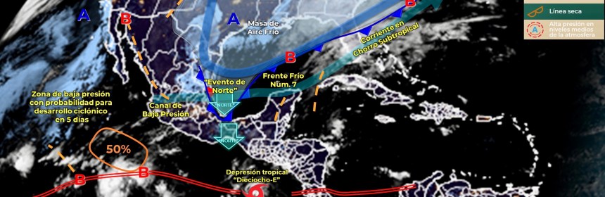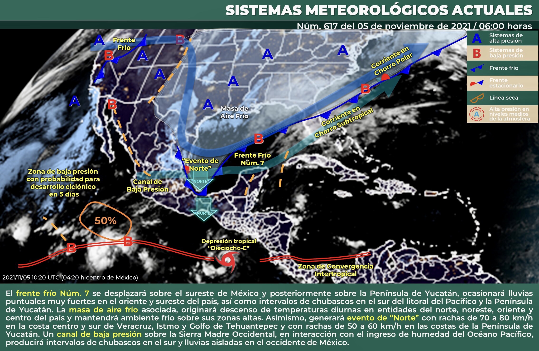 Para hoy, el frente frío Núm. 7 se desplazará sobre el sureste de México y posteriormente sobre la Península de Yucatán y ocasionará lluvias puntuales muy fuertes en el oriente y sureste del territorio nacional, así como intervalos de chubascos en el sur del litoral del Pacífico y la Península de Yucatán. La masa de aire frío asociada, originará descenso de temperaturas diurnas en entidades del norte, noreste, oriente y centro del país y mantendrá ambiente frío sobre sus zonas altas. Asimismo, generará evento de “Norte” con rachas de 70 a 80 km/h en la costa centro y sur de Veracruz, Istmo y Golfo de Tehuantepec y con rachas de 50 a 60 km/h en las costas de la Península de Yucatán. Por su parte, un canal de baja presión sobre la Sierra Madre Occidental, en interacción con el ingreso de humedad del Océano Pacífico, producirá intervalos de chubascos en el sur y lluvias aisladas en el occidente de México.