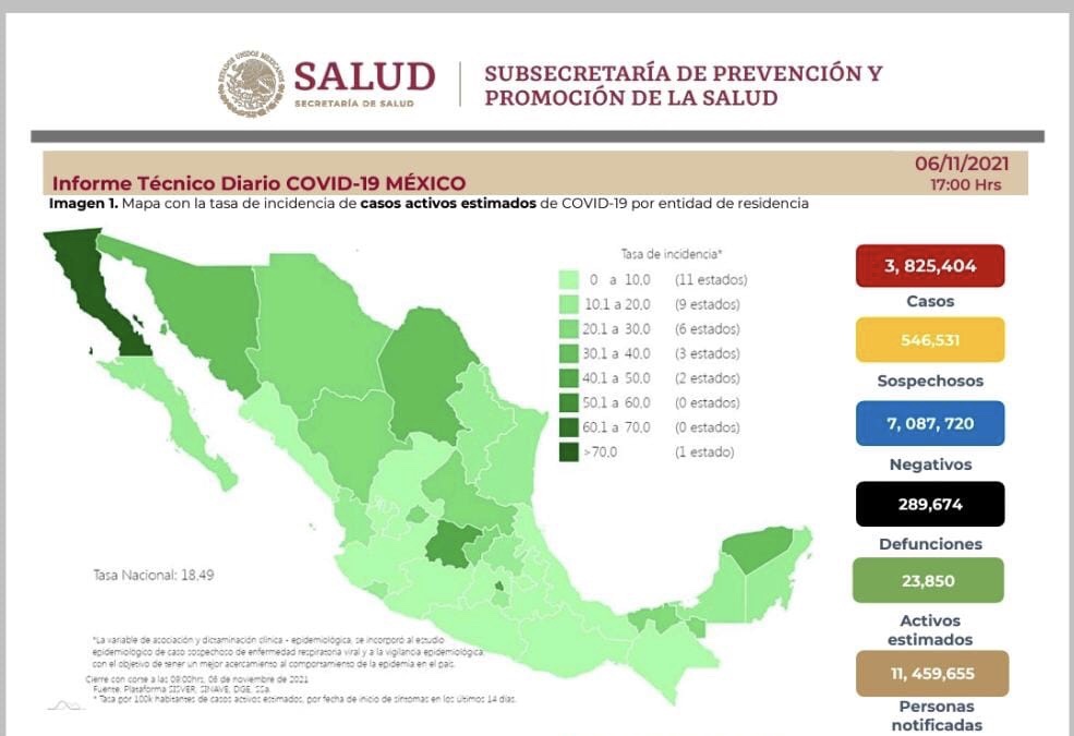 La Secretaría de Salud informó este sábado que México acumula 3 millones 825 mil 404 contagios y 289 mil 674 decesos por Covid-19.