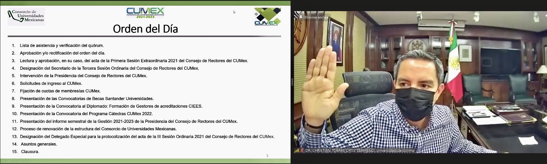 Este fin de semana, el rector de la Universidad de Colima, Dr. Christian Jorge Torres Ortiz Zermeño, participó de manera virtual en la III Sesión Ordinaria 2021 del Consejo de Rectores del Consorcio de Universidades Mexicanas (CUMex), en la que se realizó el proceso de renovación de la estructura directiva y el ingreso de la Universidad Autónoma de Chihuahua.