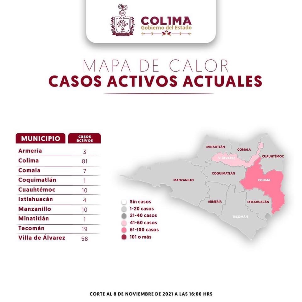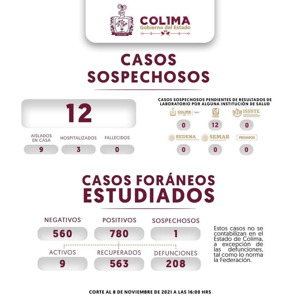 La Secretaría de Salud informa que las 7 defunciones ocurrieron en 3 hombres (uno de ellos foráneo) y en 4 mujeres entre los 55 y más de 65 años de edad que estaban hospitalizados graves; 4 eran originarios de Colima, 1 de Manzanillo, 1 de Villa de Álvarez y uno más de otra entidad federativa que era atendido en el municipio de Colima.