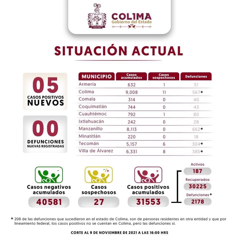Registró Colima 5 casos nuevos y 0 defunciones por Covid-19 este martes.