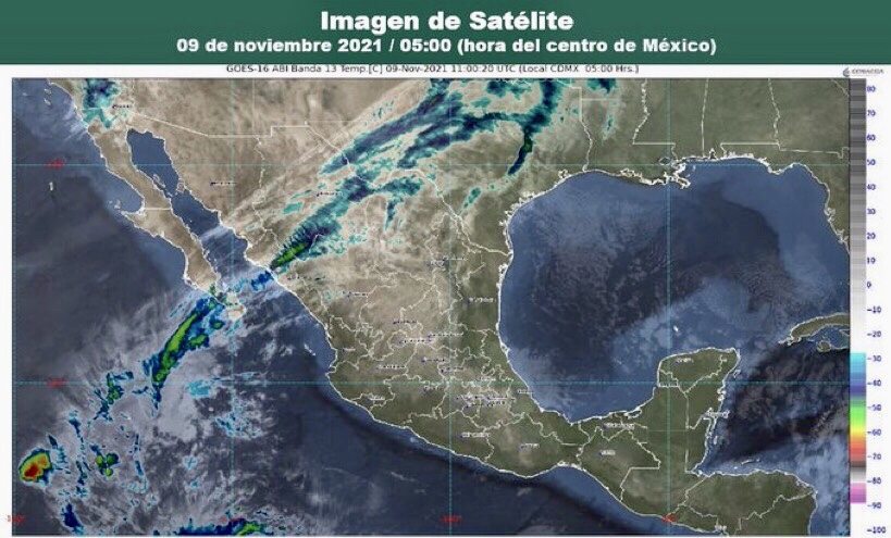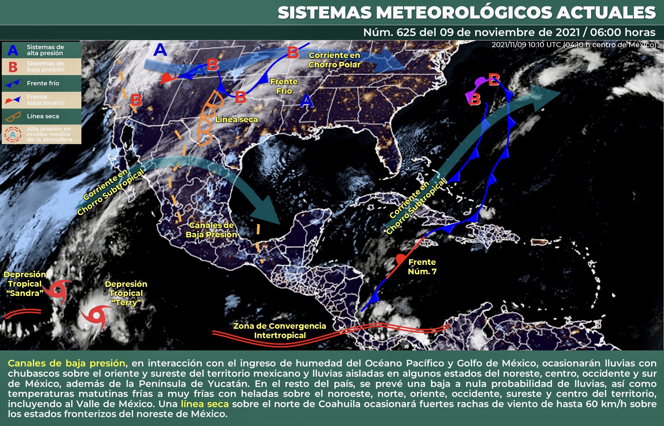 Para hoy, canales de baja presión, en interacción con el ingreso de humedad del Océano Pacífico y Golfo de México, ocasionarán lluvias con chubascos sobre el oriente y sureste del territorio mexicano y lluvias aisladas en algunos estados del noreste, centro, occidente y sur de México, además de la Península de Yucatán. En el resto del país, se prevé una baja a nula probabilidad de lluvias, así como temperaturas matutinas frías a muy frías con heladas sobre el noroeste, norte, oriente, occidente, sureste y centro del territorio, incluyendo al Valle de México. Finalmente, una línea seca sobre el norte de Coahuila ocasionará fuertes rachas de viento de hasta 60 km/h sobre los estados fronterizos del noreste de México.
