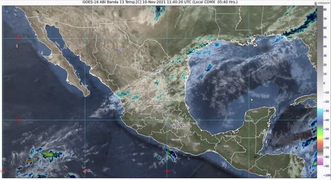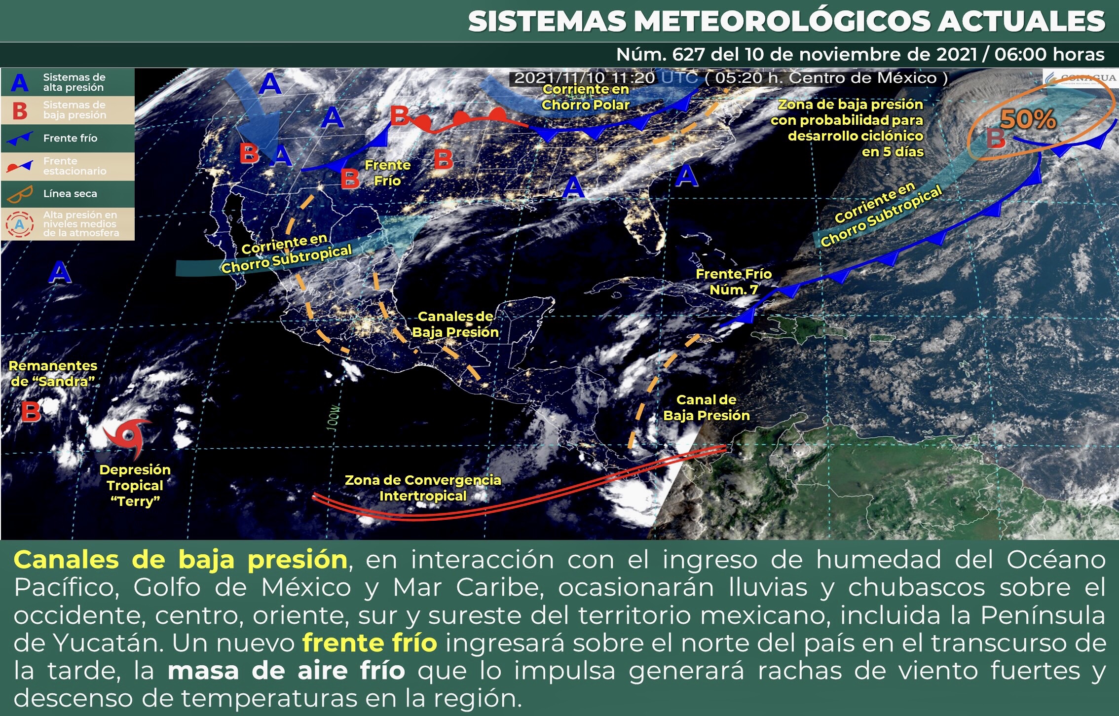 Este día, canales de baja presión sobre el oriente, sur y sureste del territorio mexicano, incluida la Península de Yucatán, en interacción con el ingreso de humedad del Océano Pacífico, Golfo de México y Mar Caribe, ocasionarán lluvias y chubascos en las regiones mencionadas, además del occidente y centro de la República Mexicana. Por otra parte, un nuevo frente frío se aproximará e ingresará sobre el norte del país en el transcurso de la tarde, la masa de aire frío que lo impulsa generará rachas de viento fuertes y descenso de temperaturas en la región.
