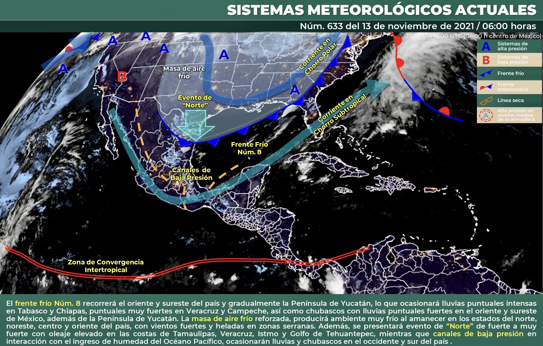 Para hoy, el frente frío Núm. 8 recorrerá el oriente y sureste del país y gradualmente la Península de Yucatán, lo que ocasionará lluvias puntuales intensas en Tabasco y Chiapas, puntuales muy fuertes en Veracruz y Campeche, así como chubascos con lluvias puntuales fuertes en el oriente y sureste de México, además de la Península de Yucatán. La masa de aire frío reforzada, producirá ambiente muy frío al amanecer en los estados del norte, noreste, centro y oriente del país, con vientos fuertes y heladas en zonas serranas. Además, se presentará evento de “Norte” de fuerte a muy fuerte con oleaje elevado en las costas de Tamaulipas, Veracruz, Istmo y Golfo de Tehuantepec, mientras que canales de baja presión en interacción con el ingreso de humedad del Océano Pacífico ocasionaran lluvias y chubascos en el occidente y sur del país.