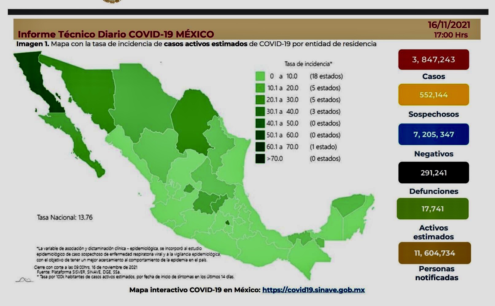 La Secretaría de Salud informó este martes que Mexico suma 3 millones 847 mil 243 casos y 291 mil 241 muertes por COVID-19.