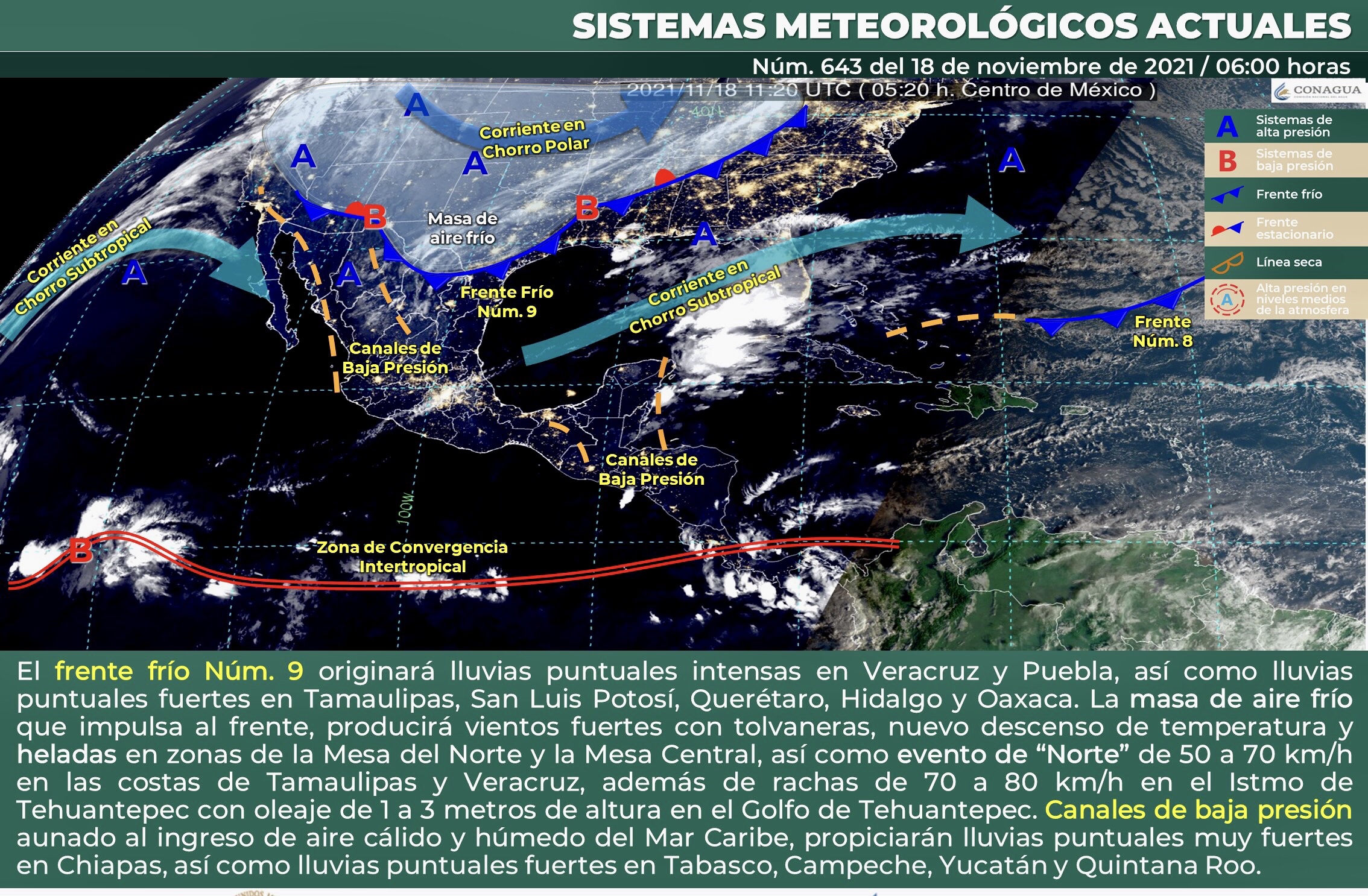 Este día, el frente frío Núm. 9 recorrerá el norte, noreste y oriente de la República Mexicana originando lluvias puntuales intensas en Veracruz y Puebla, así como lluvias puntuales fuertes en Tamaulipas, San Luis Potosí, Querétaro, Hidalgo y Oaxaca. La masa de aire frío que impulsa al frente, producirá vientos fuertes con tolvaneras, un nuevo descenso de temperatura y heladas en zonas de la Mesa del Norte y la Mesa Central, así como evento de “Norte” de 50 a 70 km/h en las costas de Tamaulipas y Veracruz, además de rachas de 70 a 80 km/h en el Istmo de Tehuantepec con oleaje de 1 a 3 metros de altura en el Golfo de Tehuantepec. Por otra parte, canales de baja presión sobre la Península de Yucatán y sureste del país, asociados al ingreso de aire cálido y húmedo del Mar Caribe, propiciarán lluvias puntuales muy fuertes en Chiapas y lluvias puntuales fuertes en Tabasco, Campeche, Yucatán y Quintana Roo.