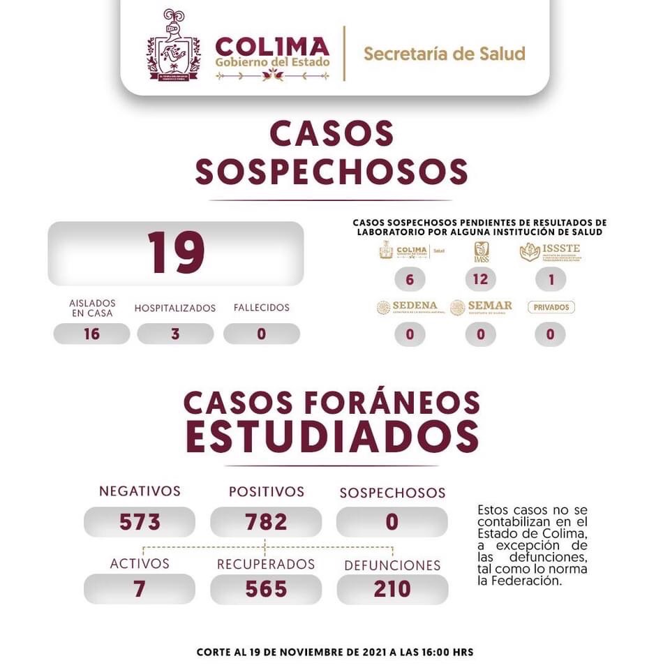 Registra Colima este viernes 7 casos nuevos y 1 deceso por Covid-19.