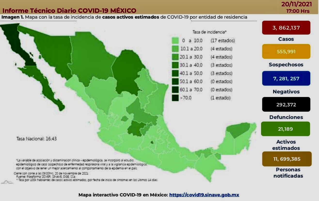 El corte de información del día de hoy, se tienen registrados 19 mil 902 casos activos con una tasa de incidencia de 15.4 por 100 mil habitantes (07 al 20 de noviembre del 2021).