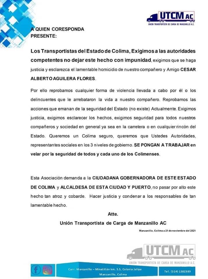 Luego de que la tarde de este domingo 21 de noviembre fuera acribillado a balazos delante de su familia el empresario transportista César Aguilera, la Unión Transportista de Carga de Manzanillo, exigieron a las autoridades justicia ante el ante el artero asesinato.