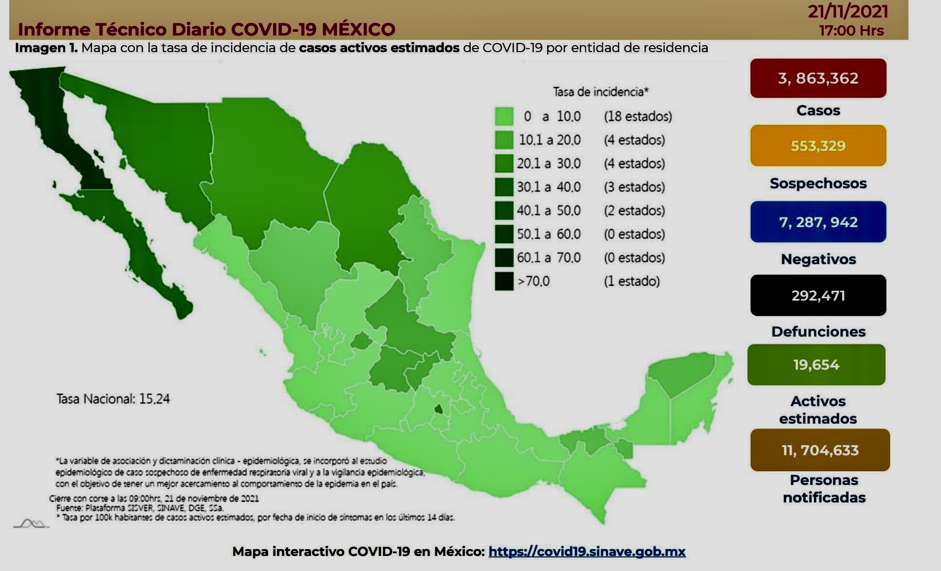La Secretaría de Salud informó este domingo que México suma 3 millones 863 mil 362 casos y 292 mil 471 muertes por COVID-19
