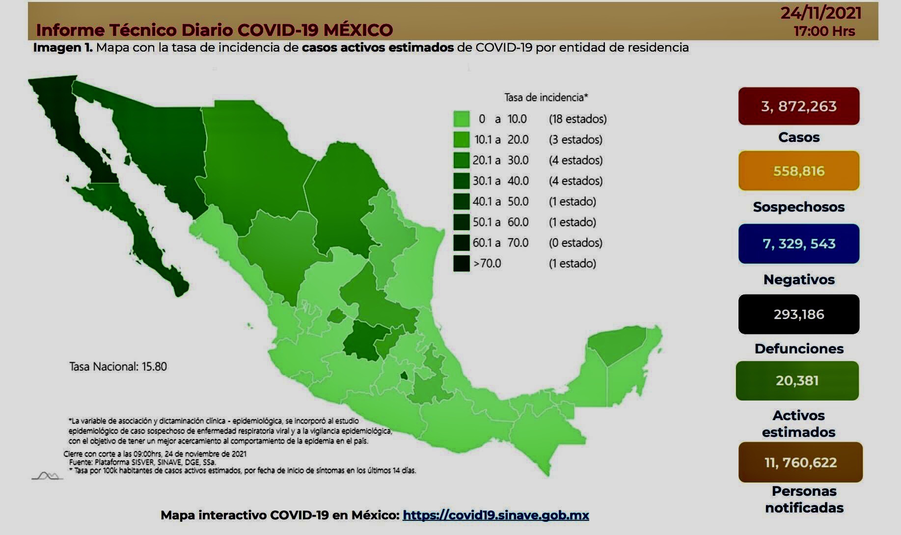 La Secretaría de Salud informó este miércoles que México suma 3 millones 872 mil 263 casos y 293 mil 186 muertes por Covid-19.
