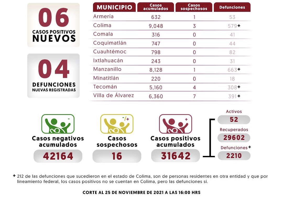 Este jueves, Colima registró 6 casos nuevos y 4 decesos por Covid-19.