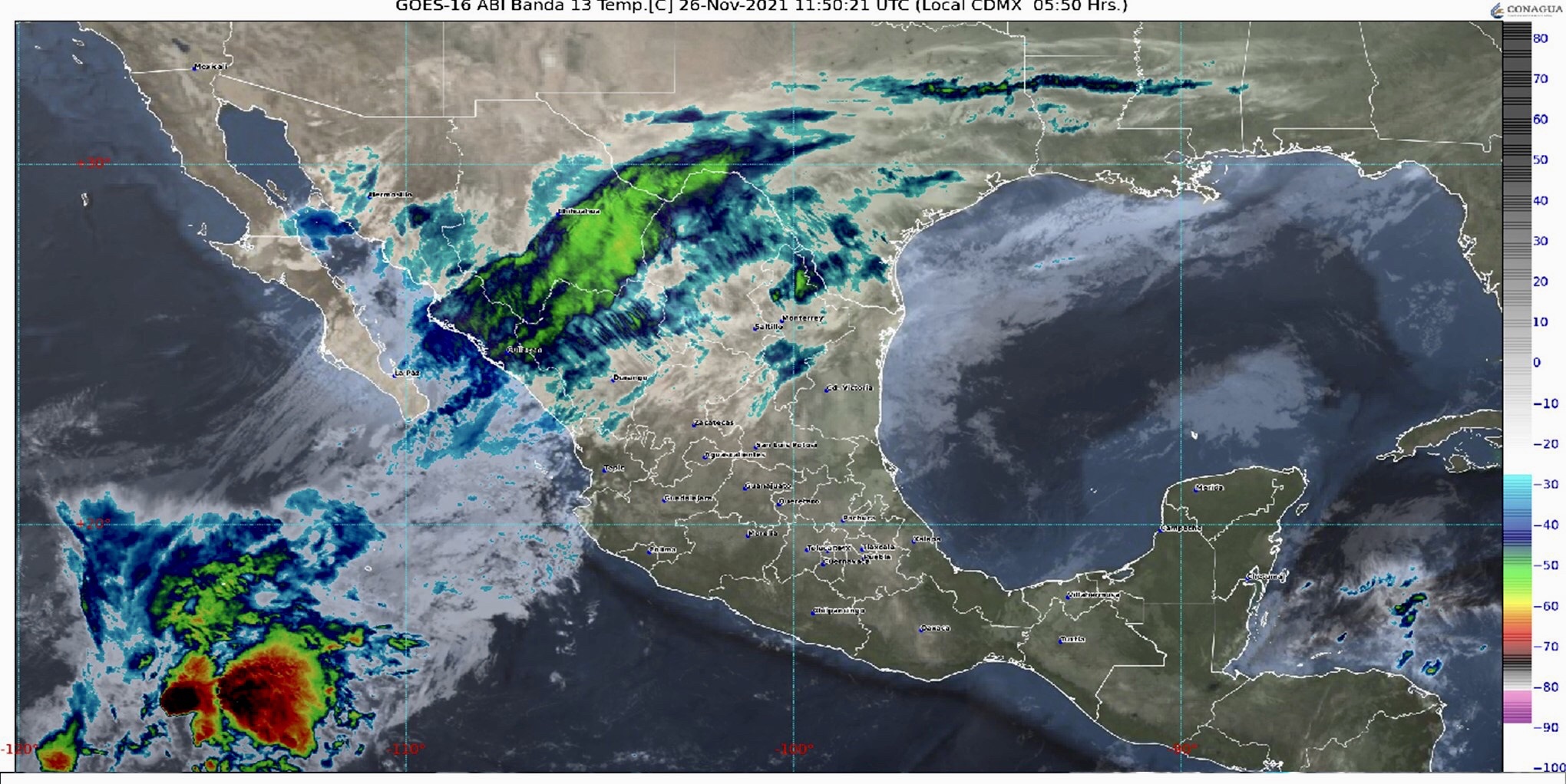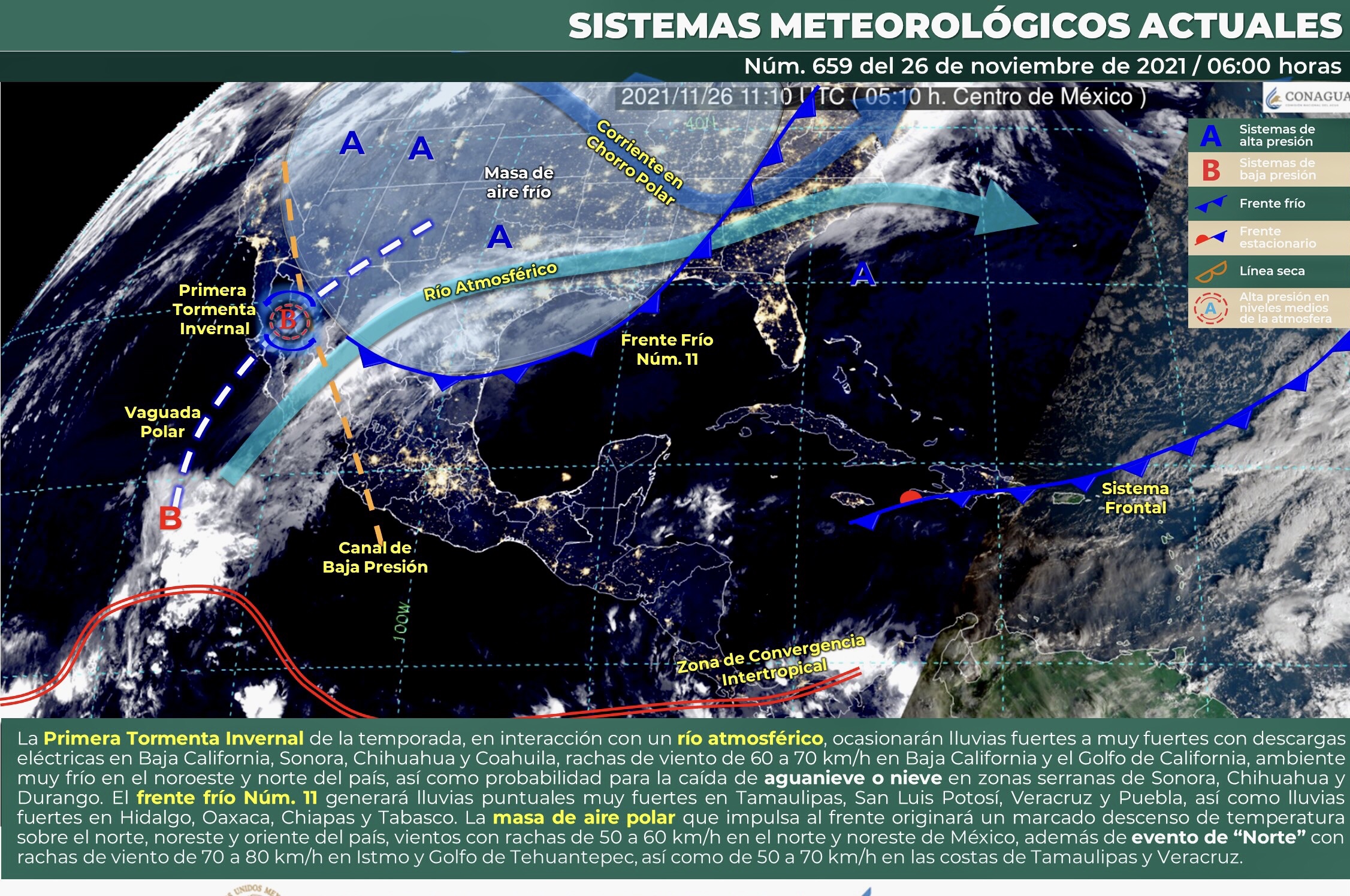 Para hoy, el frente frío Núm. 11 recorrerá el noreste y oriente del país, extendiéndose por la tarde sobre el Golfo de México hasta el sur de Veracruz, ocasionará lluvias fuertes a muy fuertes en Tamaulipas, San Luis Potosí, Puebla, Veracruz, Hidalgo, Oaxaca, Chiapas y Tabasco. La masa de aire polar asociada a dicho frente provocará ambiente muy frío con heladas al amanecer sobre el noreste, oriente y centro del territorio nacional, nieblas en zonas serranas de dichas regiones, además de evento de “Norte” con rachas de 70 a 80 km/h en el Istmo y Golfo de Tehuantepec, así como de 50 a 70 km/h en las costas de Tamaulipas y Veracruz. Por otra parte, la Primera Tormenta Invernal, en interacción con el abundante ingreso de humedad generado por el río atmosférico, propiciará ambiente muy frío, heladas matutinas, lluvias y vientos fuertes sobre el noroeste y norte de la República Mexicana, así como probabilidad para la caída de aguanieve o nieve en sierras de Sonora, Chihuahua y Durango.