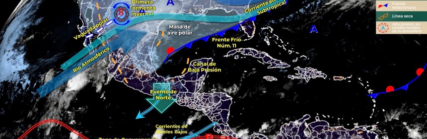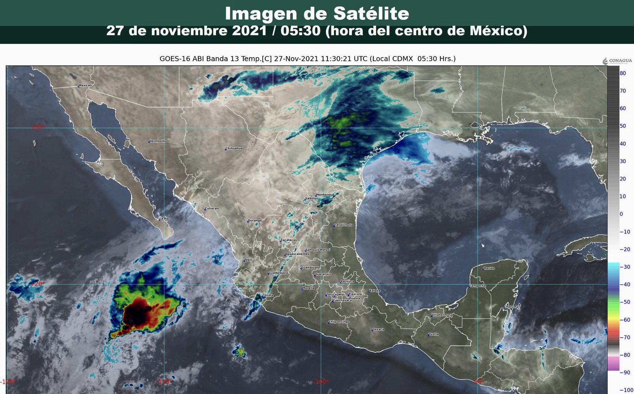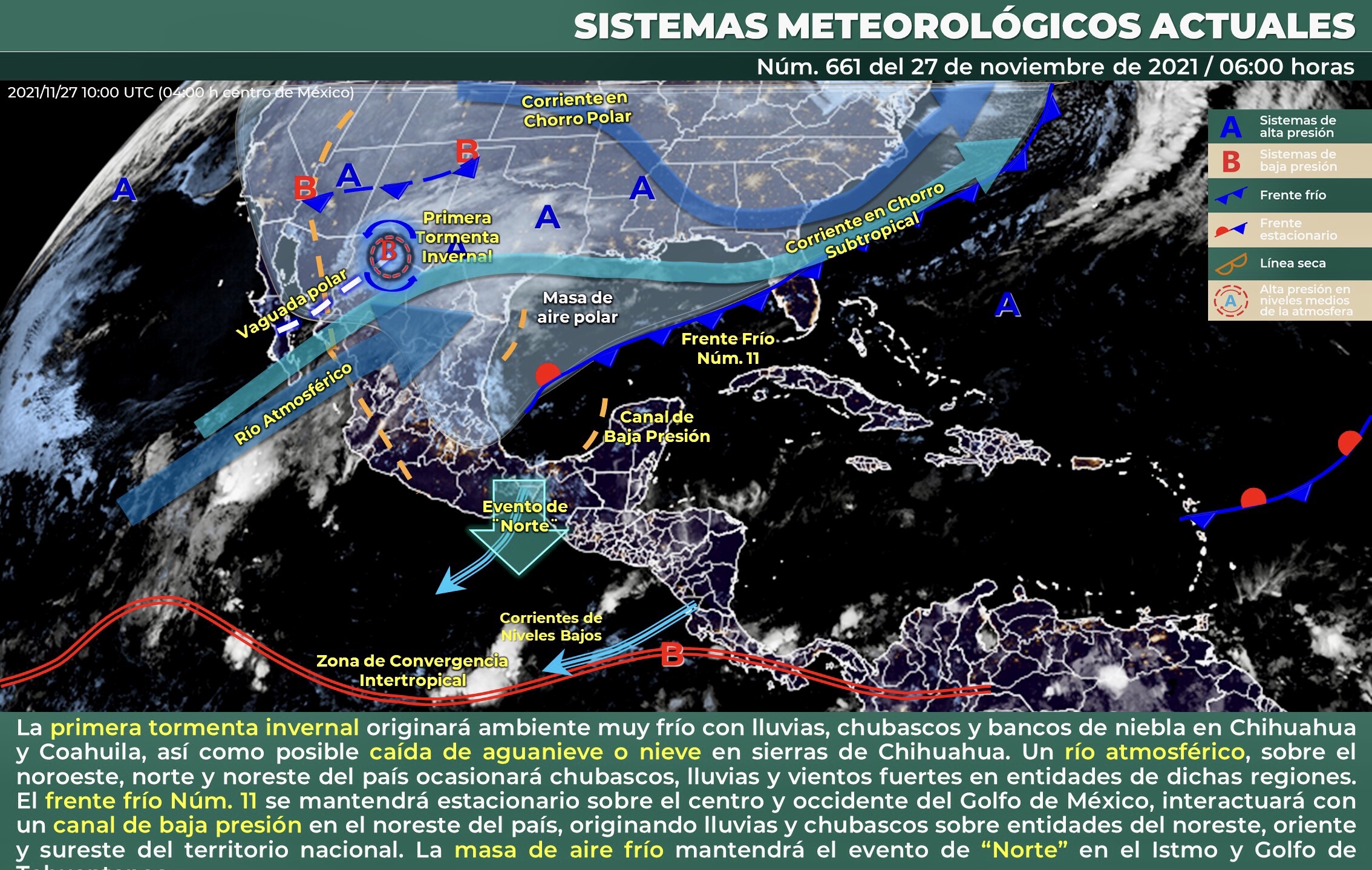 Para el día de hoy, la primera tormenta invernal recorrerá el norte de Chihuahua, manteniendo ambiente muy frío con lluvias, chubascos y bancos de niebla en Chihuahua y Coahuila, así como posible caída de aguanieve o nieve en las sierras de Chihuahua. Se prevé que en el transcurso del día, el sistema ingrese a Texas, E.U.A. y deje de afectar al territorio nacional. Un río atmosférico, sobre el noroeste, norte y noreste de la República Mexicana ocasionará chubascos, lluvias y vientos fuertes en las entidades de dichas regiones. El frente frío Núm. 11 se extenderá estacionario sobre el centro y occidente del Golfo de México, continuará interactuando con un canal de baja presión en el noreste del país, originando lluvias y chubascos dispersos sobre entidades del noreste, oriente y sureste del territorio nacional. La masa de aire frío asociada comenzará a modificar sus características térmicas, favoreciendo un gradual incremento de las temperaturas diurnas en el noreste y oriente del país, sin embargo, el ambiente seguirá siendo frío sobre entidades de la Mesa del Norte y Mesa Central con heladas matutinas en sus zonas altas. A su vez, se prevén bancos de niebla en la Sierra Madre Oriental y el sureste de México, así como evento de “Norte” en el Istmo y Golfo de Tehuantepec, condición que disminuirá gradualmente durante el día.