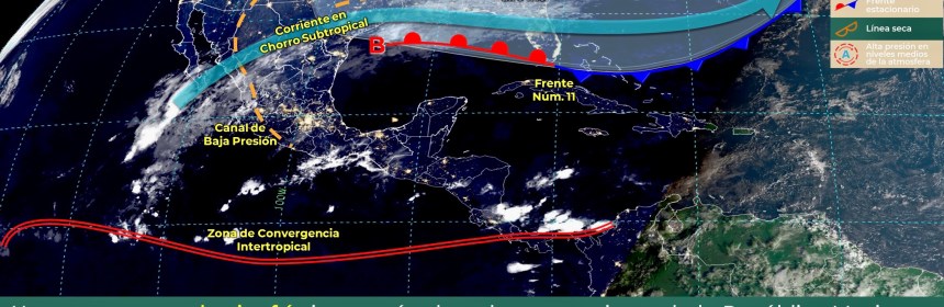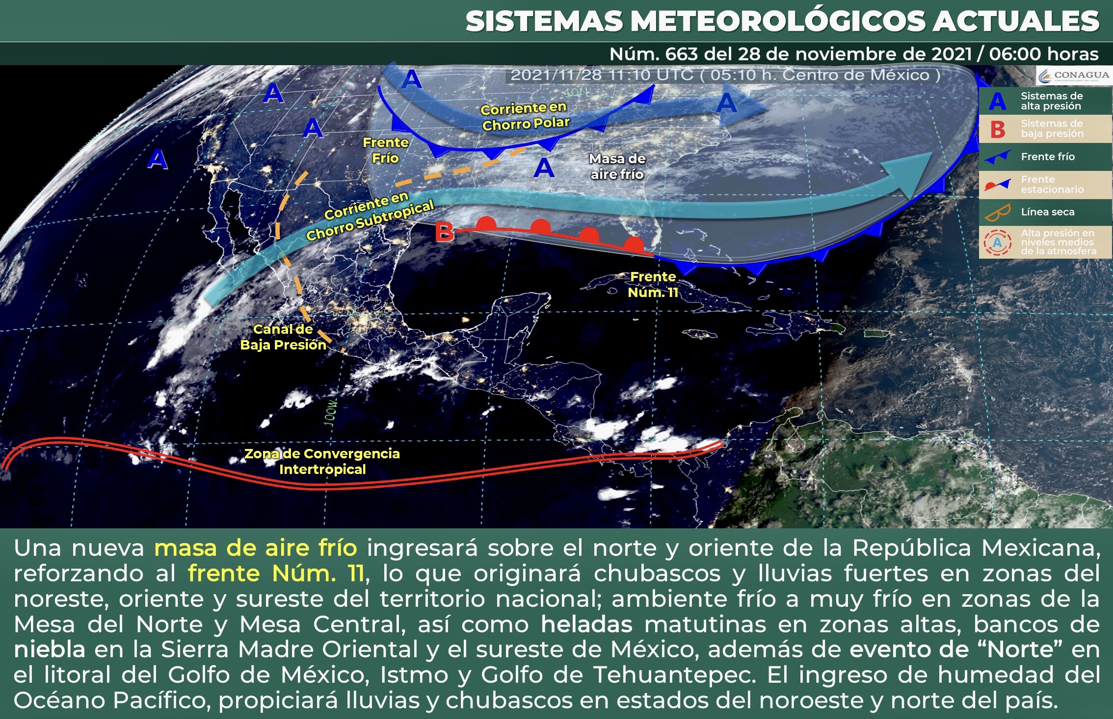 Este día, una nueva masa de aire frío ingresará sobre el norte y oriente de la República Mexicana, reforzando al frente Núm. 11, lo que originará chubascos y lluvias puntuales fuertes en zonas del noreste, oriente y sureste del territorio nacional; ambiente frío a muy frío en zonas de la Mesa del Norte y Mesa Central, así como heladas matutinas en zonas altas, bancos de niebla en la Sierra Madre Oriental y el sureste de México, además de evento de “Norte” en el litoral del Golfo de México, Istmo y Golfo de Tehuantepec. Por otra parte, el ingreso de humedad del Océano Pacífico, propiciará lluvias y chubascos en estados del noroeste y norte del país.