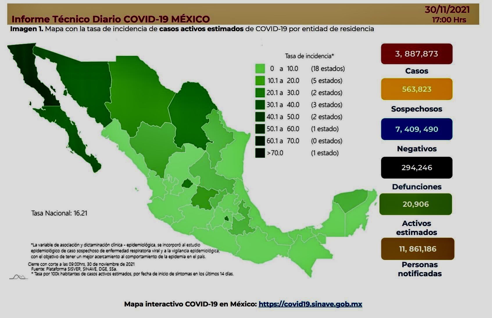 La Secretaría de Salud informó este martes que México suma 3 millones 887 mil 873 casos y 294 mil 246 muertes por Covid-19