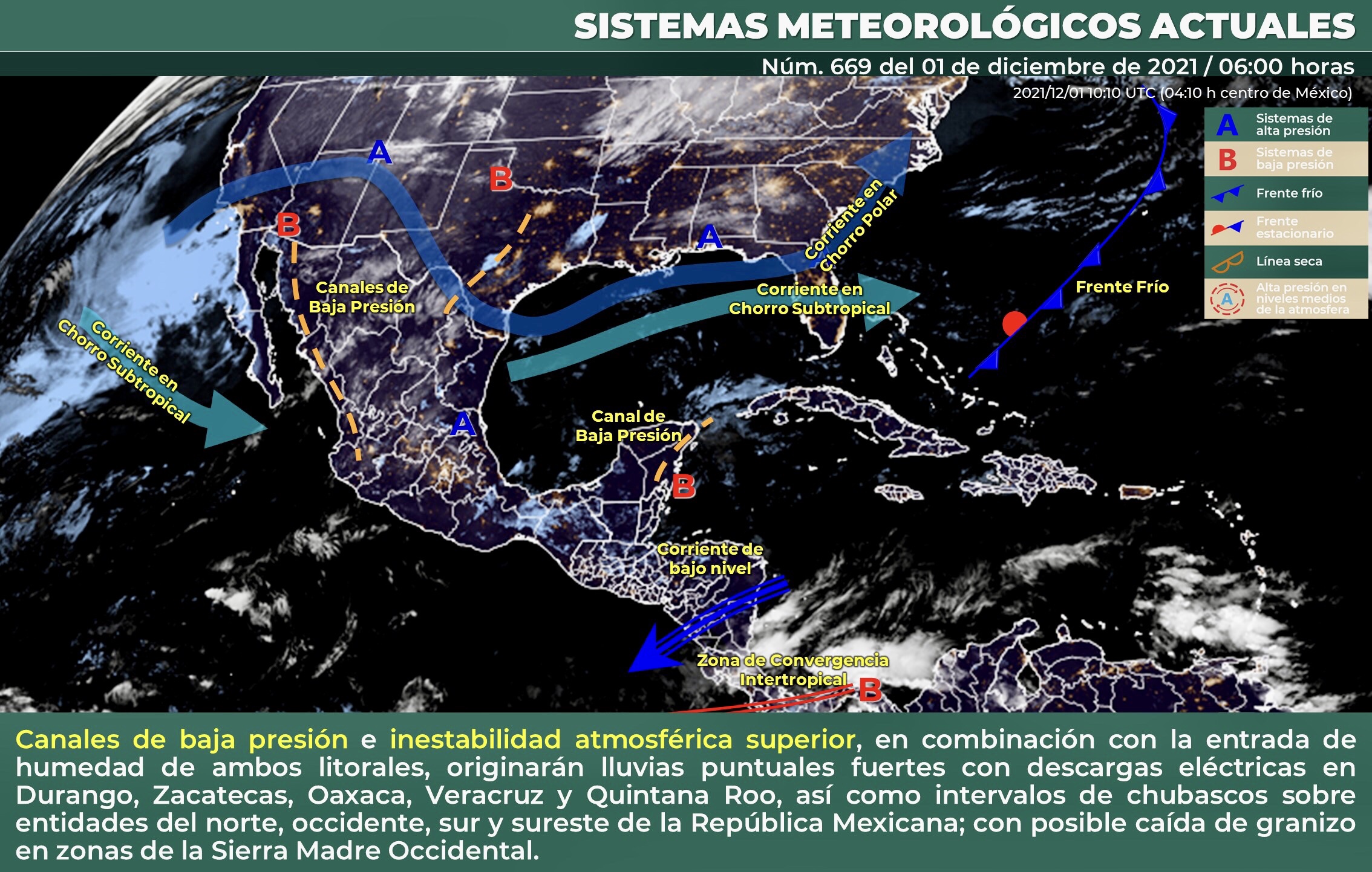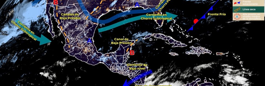 Para hoy, canales de baja presión e inestabilidad atmosférica superior, en combinación con la entrada de humedad de ambos litorales, originarán lluvias puntuales fuertes acompañadas de descargas eléctricas en Durango, Zacatecas, Oaxaca (oriente), Veracruz (sur) y Quintana Roo, así como intervalos de chubascos sobre entidades del norte, occidente, sur y sureste de la República Mexicana; con posible caída de granizo en zonas de la Sierra Madre Occidental. Finalmente se mantendrá ambiente frío durante la noche y madrugada, sobre entidades de la Mesa del Norte y Mesa Central.