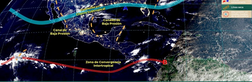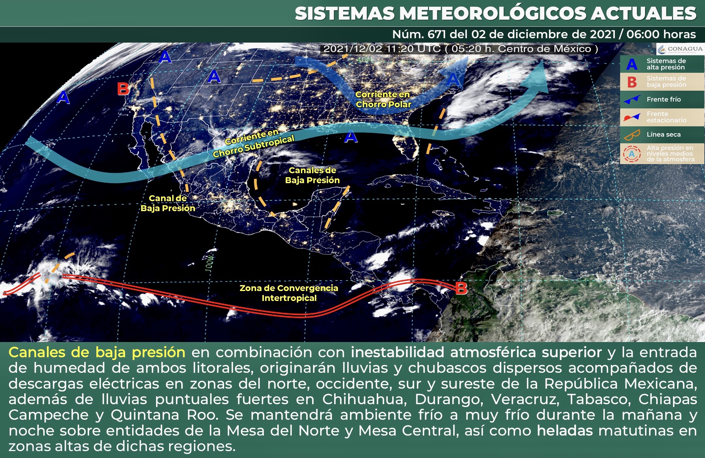 Este día, canales de baja presión en combinación con inestabilidad atmosférica superior y la entrada de humedad de ambos litorales, originarán lluvias y chubascos dispersos acompañados de descargas eléctricas en zonas del norte, occidente, sur y sureste de la República Mexicana, además de lluvias puntuales fuertes en Chihuahua, Durango, Veracruz, Tabasco, Chiapas, Campeche y Quintana Roo. A su vez, se mantendrá ambiente frío a muy frío durante la mañana y noche sobre entidades de la Mesa del Norte y Mesa Central, así como heladas matutinas en zonas altas de dichas regiones.