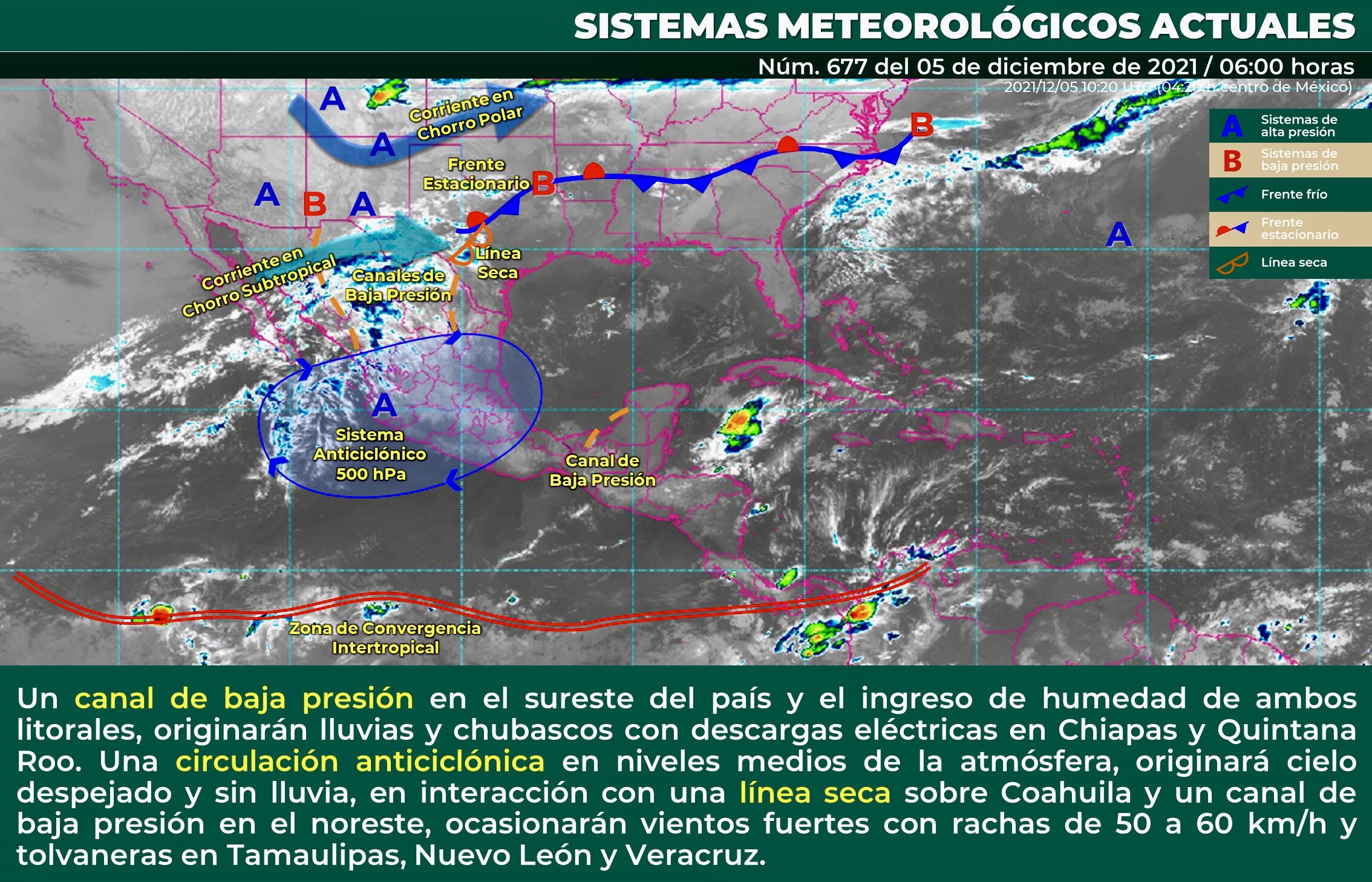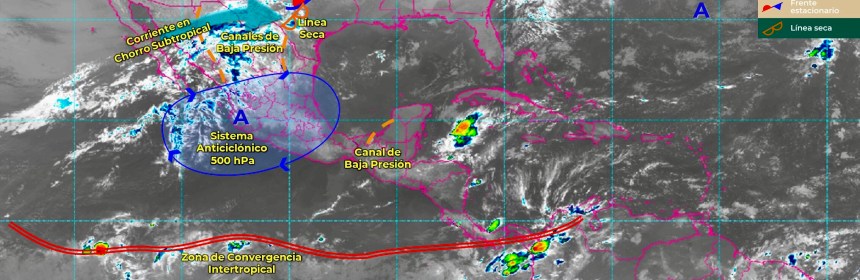 Para hoy, un canal de baja presión en el sureste del país y el ingreso de humedad de ambos litorales, originarán lluvias y chubascos vespertinos acompañados de descargas eléctricas en Chiapas y Quintana Roo. Asimismo, una circulación anticiclónica en niveles medios de la atmósfera, originará cielo despejado y sin lluvia, además de temperaturas cálidas a calurosas durante la tarde en gran parte del territorio nacional que en interacción con una línea seca sobre Coahuila y un canal de baja presiónen el noreste, ocasionarán vientos fuertes con rachas de 50 a 60 km/h y tolvaneras en Tamaulipas, Nuevo León y Veracruz. Por otro se mantendrá el ambiente frío a muy frío durante la mañana y noche sobre entidades de la Mesa del Norte y la Mesa Central, con heladas matutinas en sus zonas altas.