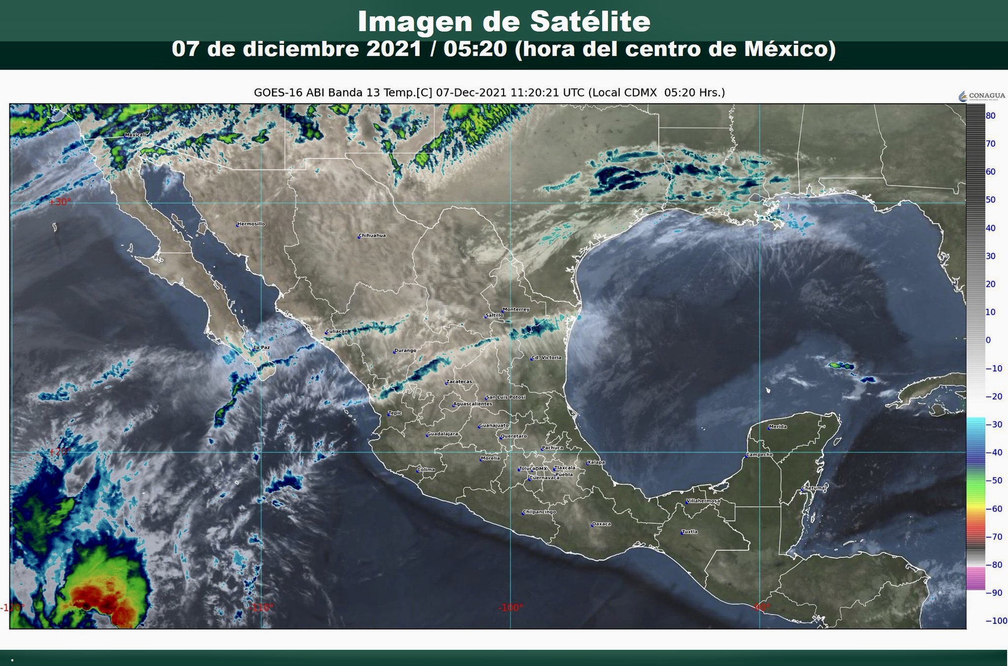 Heladas para la madrugada del miércoles: Baja California, Sonora, Chihuahua, Durango, Coahuila, Nuevo León, San Luis Potosí, Zacatecas, Aguascalientes, Jalisco, Guanajuato, Estado de México, Tlaxcala y Puebla.