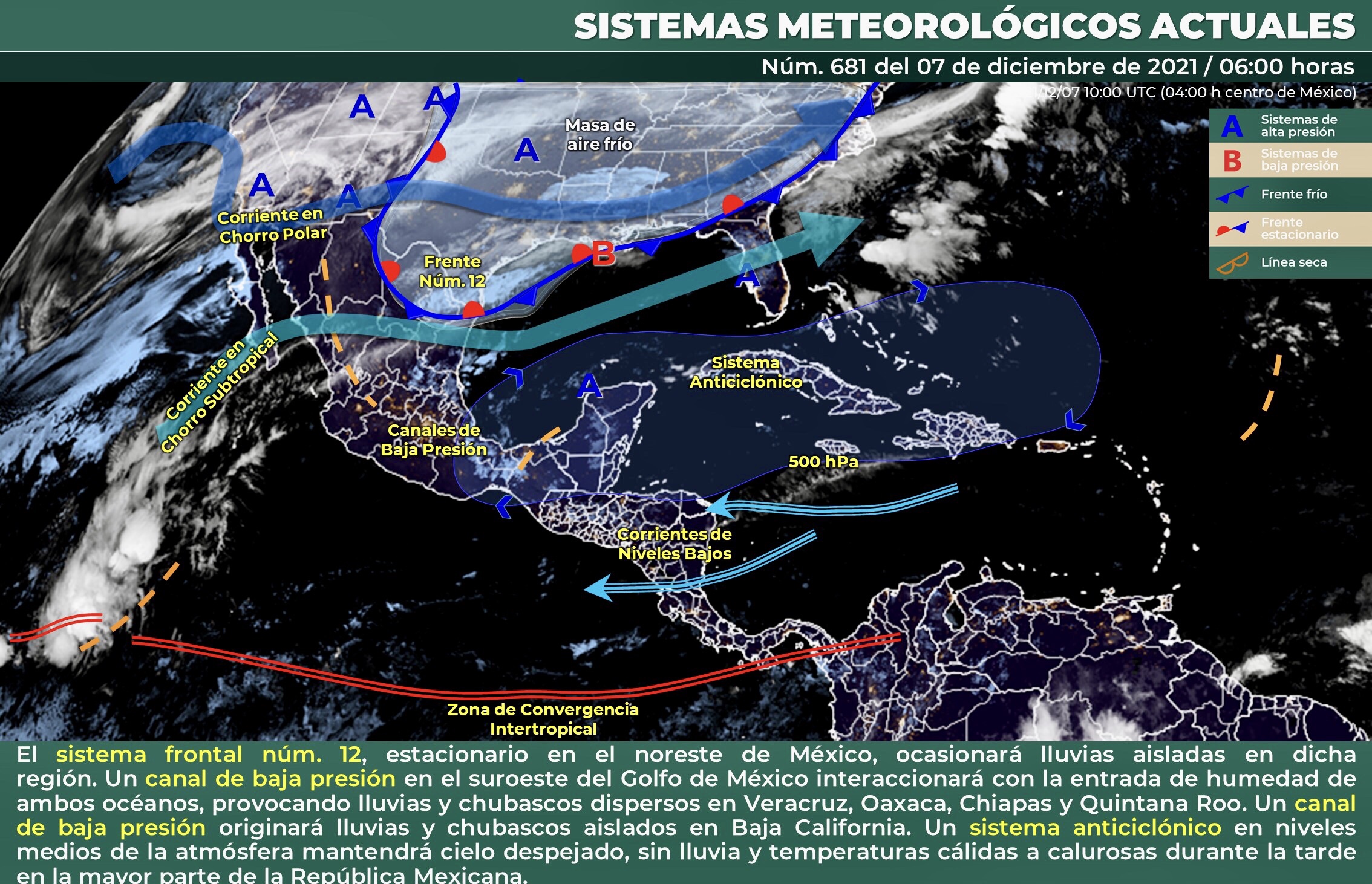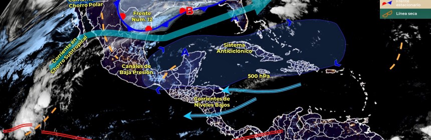 Para el día de hoy, el sistema frontal núm. 12 se localizará como estacionario sobre el noreste de México y ocasionará lluvias aisladas en dicha región. La masa de aire frío que impulsó al frente, mantendrá descenso de la temperatura y heladas al amanecer en zonas montañosas del norte y noreste del país. Un canal de baja presión se localizará sobre el suroeste del Golfo de México e interaccionará con la entrada de humedad de ambos océanos, provocando lluvias y chubascos dispersos en regiones de Veracruz, Oaxaca, Chiapas y Quintana Roo. Por otra parte, un canal de baja presión en interacción con la entrada de humedad generada por la corriente en chorro, originará lluvias y chubascos aislados en Baja California. Finalmente, un sistema anticiclónico en niveles medios de la atmósfera mantendrá cielo despejado, sin lluvia y temperaturas cálidas a calurosas durante la tarde en la mayor parte de la República Mexicana.