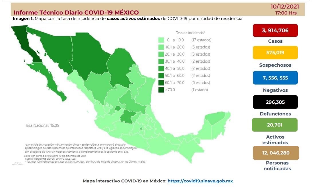 En el territorio hay 19 mil 507 casos activos. Los estados con más casos activos por cada 100 mil habitantes, es decir, con personas que reportaron síntomas de la enfermedad en los últimos 14 días, son: Baja California, Sonora, Chihuahua, Coahuila y Baja California Sur.