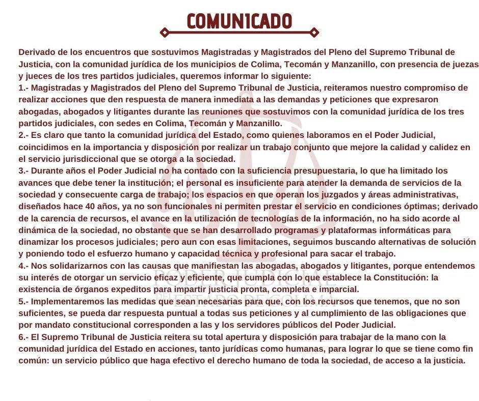Derivado de los encuentros que sostuvimos Magistradas y Magistrados del Pleno del Supremo Tribunal de Justicia, con la comunidad jurídica de los municipios de Colima,Tecomán y Manzanillo, con presencia de juezas y jueces de los tres partidos judiciales, queremos informar lo siguiente: