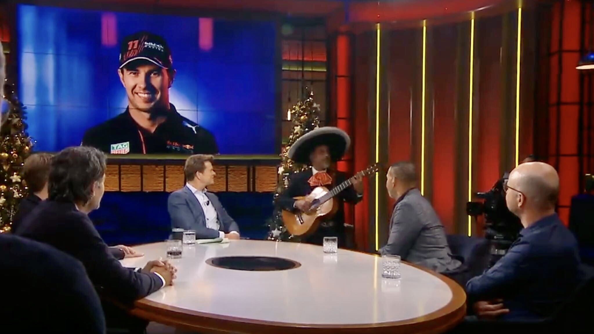 Noticiero en Holanda le lleva mariachi a Checo Pérez por su apoyo a Verstappen; de paso se disculpan por el “No era penal”.