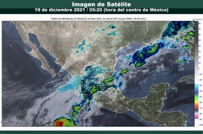 Golfo de México: Cielo nublado durante el día con lluvias puntuales intensas en Tamaulipas y Veracruz, así como fuertes en Tabasco. Ambiente frío con bancos de niebla matutinos en la región. Evento de “Norte” con rachas de 70 a 80 km/h y olas de 2 a 3 metros de altura en costas de Tamaulipas y Veracruz.