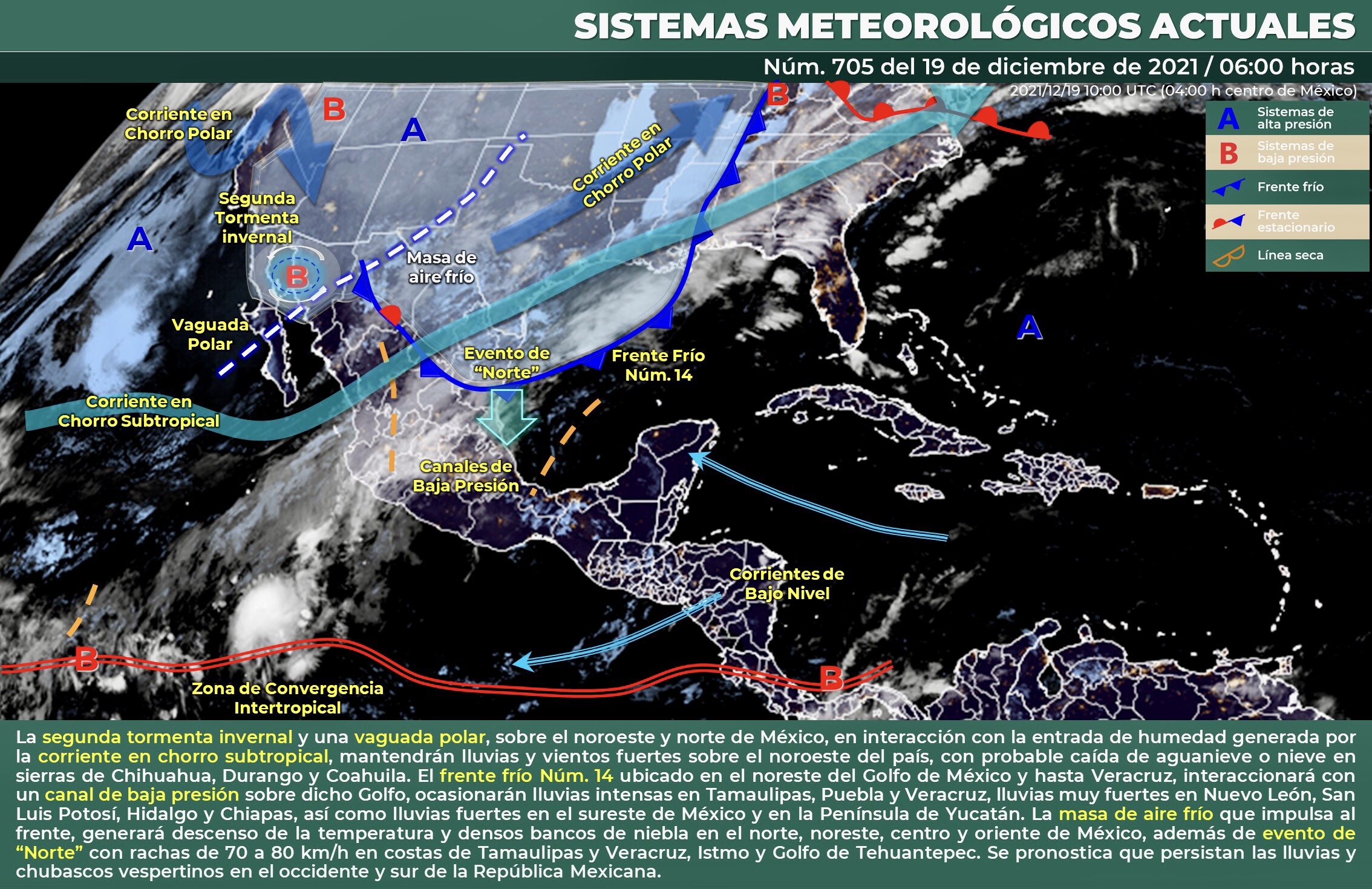 Para el día de hoy, la segunda tormenta invernal y una vaguada polar, sobre el noroeste y norte de México, en interacción con la entrada de humedad generada por la corriente en chorro subtropical, mantendrán las condiciones para lluvias y vientos fuertes sobre entidades del noroeste del territorio nacional, con probable caída de aguanieve o nieve en sierras de Chihuahua, Durango y Coahuila, condición que disminuirá hacia la tarde del domingo. Por su parte, el frente frío Núm. 14 se extenderá desde el noreste del Golfo de México hasta Veracruz, interaccionará con un canal de baja presiónsobre dicho Golfo, ocasionará lluvias puntuales intensas en Tamaulipas, Puebla y Veracruz, lluvias muy fuertes en Nuevo León, San Luis Potosí, Hidalgo y Chiapas, así como lluvias puntuales fuertes en el sureste mexicano y en la Península de Yucatán. La masa de aire frío que impulsa al frente, generará descenso de la temperatura y densos bancos de niebla en el norte, noreste, centro y oriente de México, además de evento de “Norte” con rachas de 70 a 80 km/h en las costas de Tamaulipas y Veracruz, Istmo y Golfo de Tehuantepec. Finalmente, persistirán las lluvias y chubascos vespertinos en el occidente y sur de la República Mexicana.