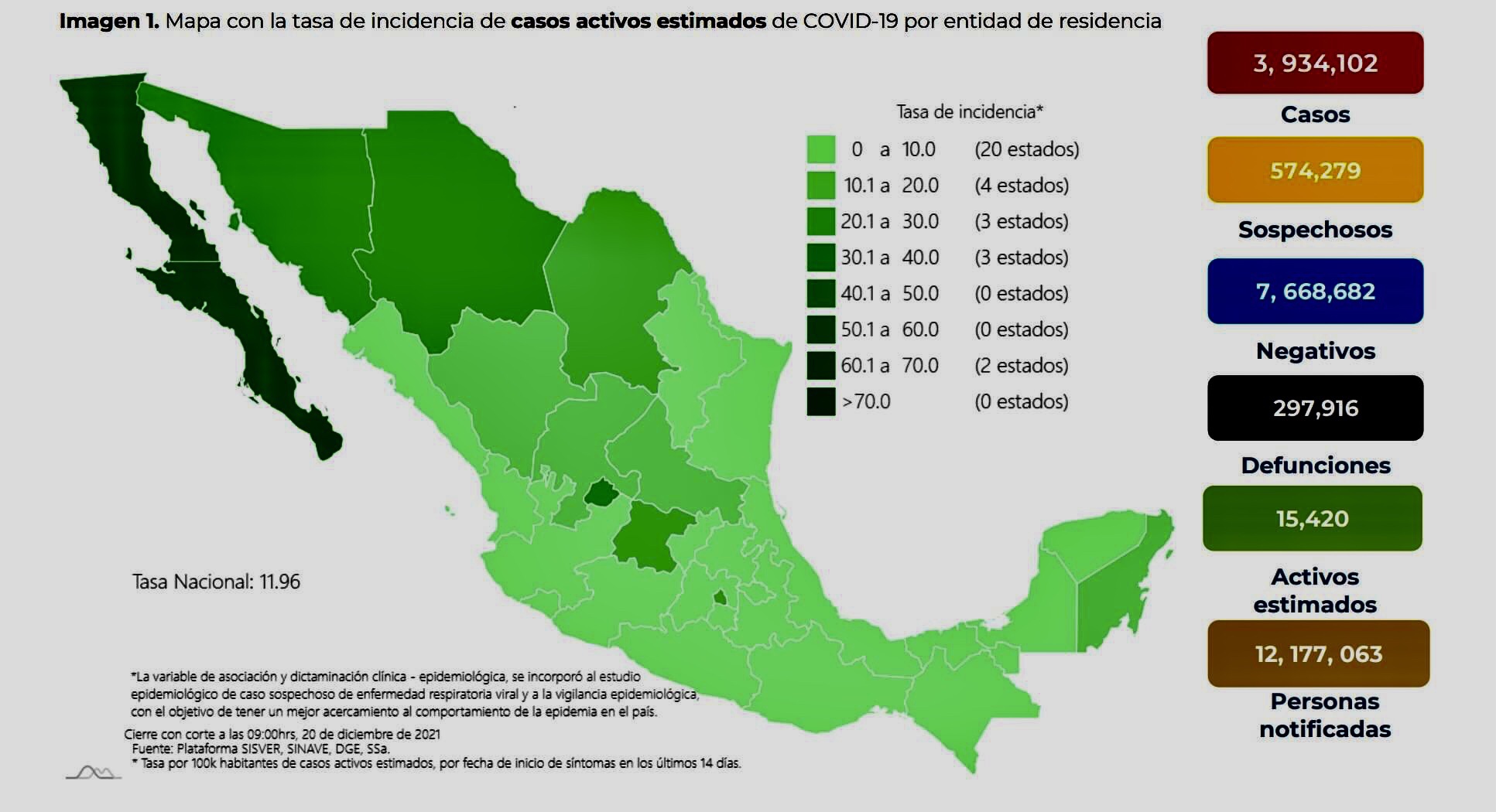 La Secretaría de Salud informó este lunes que México suma 3 millones 934 mil 102 casos y 297 mil 916 muertes por Covid-19.