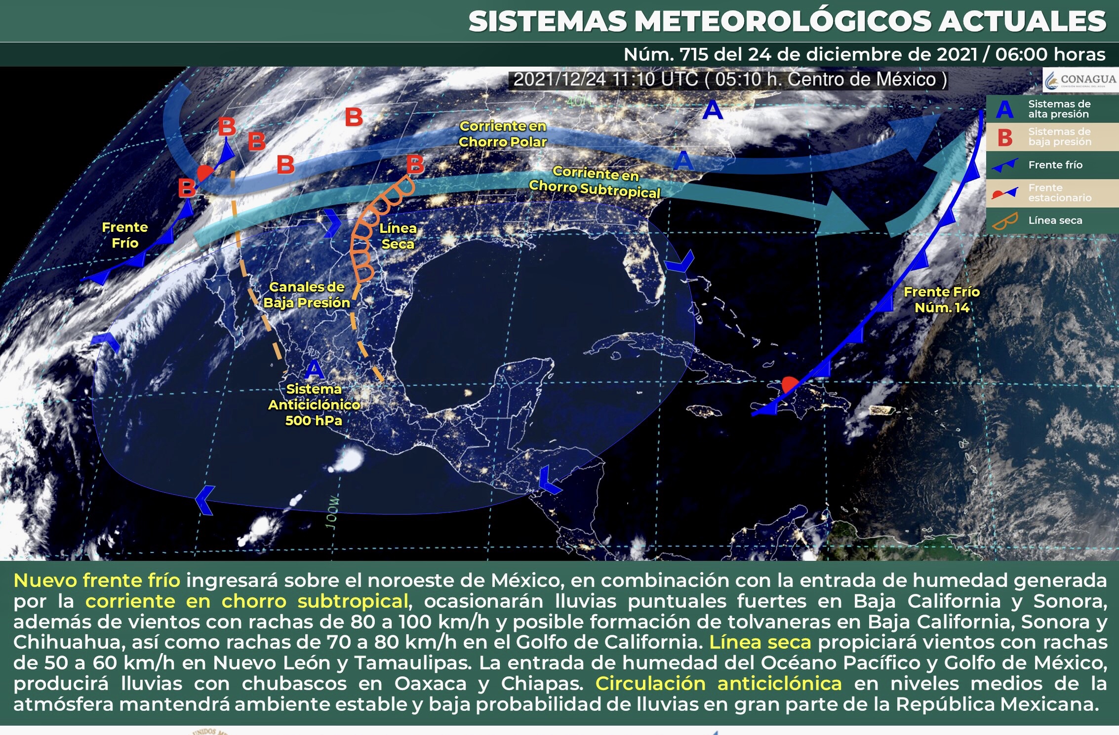 Durante este día, se pronostica el ingreso de un nuevo frente frío sobre el noroeste de México, y en combinación con la entrada de humedad generada por la corriente en chorro subtropical, ocasionarán lluvias puntuales fuertes en Baja California y Sonora, además de vientos con rachas de 80 a 100 km/h y posible formación de tolvaneras en Baja California, Sonora y Chihuahua, así como rachas de 70 a 80 km/h en el Golfo de California. Asimismo, una línea seca, sobre el norte y noreste del territorio nacional propiciará vientos con rachas de 50 a 60 km/h en dichas regiones. Por otro lado, la entrada de humedad del Océano Pacífico y Golfo de México, producirá lluvias con chubascos en Oaxaca y Chiapas, así como lluvias aisladas en Guerrero y Quintana Roo. Finalmente, una circulación anticiclónica en niveles medios de la atmósfera, mantendrá ambiente cálido a caluroso, cielo despejado y baja probabilidad de lluvia sobre la mayor parte de la República Mexicana. Sin embargo, continuará el ambiente frío a muy frío con heladas al amanecer sobre entidades del noroeste, norte, noreste y centro de México.