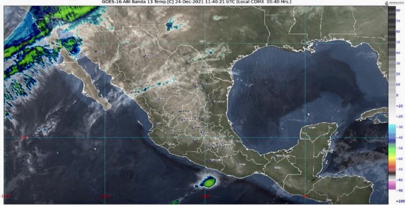 Golfo de México: Cielo medio nublado durante el día, sin lluvias en la región. Ambiente frío con bancos de niebla matutinos y heladas en zonas montañosas de Veracruz. Viento de componente sur con rachas de 50 a 60 km/h en Tamaulipas.