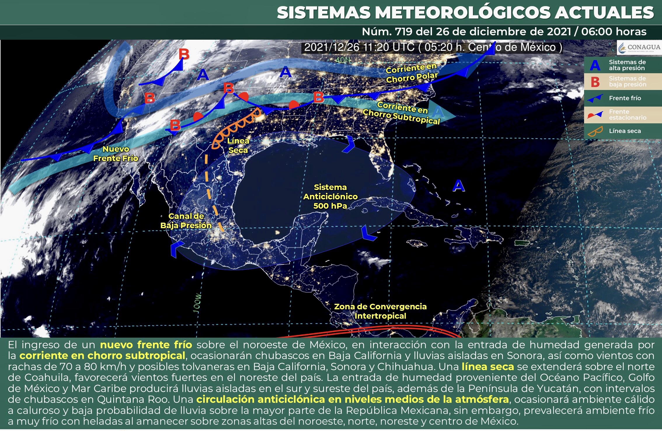 Durante este día, se pronostica el ingreso de un nuevo frente frío sobre el noroeste de México, en interacción con la entrada de humedad generada por la corriente en chorro subtropical, ocasionarán chubascos en Baja California y lluvias aisladas en Sonora, así como vientos con rachas de 70 a 80 km/h y posibles tolvaneras en Baja California, Sonora y Chihuahua. Por otro lado, una línea seca se extenderá sobre el norte de Coahuila y favorecerá vientos fuertes en el noreste del país. Además, la entrada de humedad proveniente del Océano Pacífico, Golfo de México y Mar Caribe producirá lluvias aisladas en el sur y sureste del país, además de la Península de Yucatán, con intervalos de chubascos en Quintana Roo. Finalmente, se mantendrá una circulación anticiclónica en niveles medios de la atmósfera, ocasionará ambiente cálido a caluroso, cielo despejado y baja probabilidad de lluvia sobre la mayor parte de la República Mexicana, sin embargo, prevalecerá ambiente frío a muy frío con heladas al amanecer sobre zonas altas del noroeste, norte, noreste y centro de México.