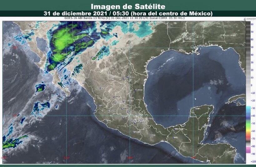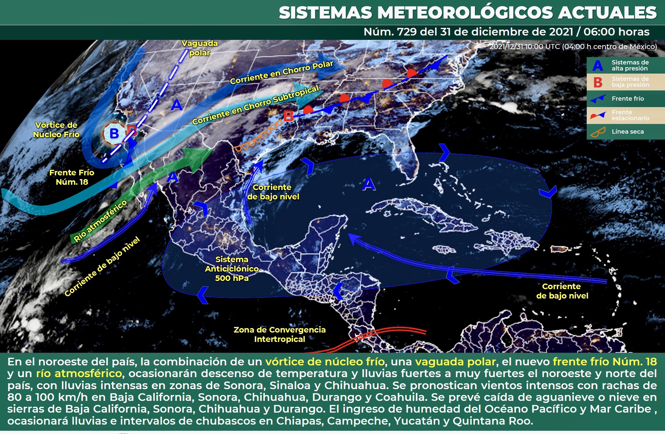 Durante este día en el noroeste del país, la combinación de un vórtice de núcleo frío, una vaguada polar, el nuevo frente frío Núm. 18 y un río atmosférico, ocasionarán descenso de temperatura y lluvias fuertes a muy fuertes sobre entidades del noroeste y norte de México, con lluvias puntuales intensas en zonas de Sonora, Sinaloa y Chihuahua. Así mismo se pronostican vientos intensos con rachas de 80 a 100 km/h en Baja California, Sonora, Chihuahua, Durango y Coahuila. Además, prevalecerán las condiciones para la caída de aguanieve o nieve en sierras de Baja California, Sonora, Chihuahua y Durango. Mientras que, el ingreso de humedad del Océano Pacífico y Mar Caribe, ocasionará lluvias e intervalos de chubascos en Chiapas, Campeche, Yucatán y Quintana Roo. Finalmente, un sistema anticiclónico mantendrá cielo despejado, tiempo estable con ambiente vespertino cálido caluroso sobre el resto de la República Mexicana, sin embargo, continuará ambiente frío a muy frío con heladas al amanecer en zonas altas del noroeste, norte, occidente, centro y oriente del territorio nacional.