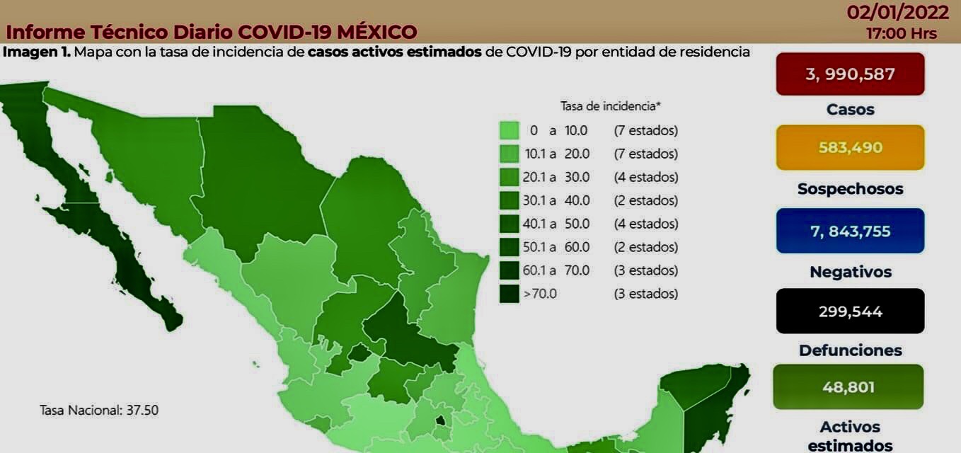 La Secretaría de Salud informó este domingo que México suma 3 millones 990 mil 587 casos positivos confirmados y 299 mil 544 defunciones totales por Covid-19.