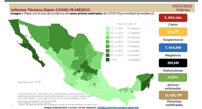 La Secretaría de Salud informó este lunes que Mexico suma 3 millones 993 mil 464 casos positivos confirmados acumulados y 299 mil 581 defunciones totales por Covid-19.